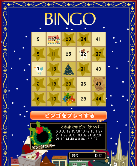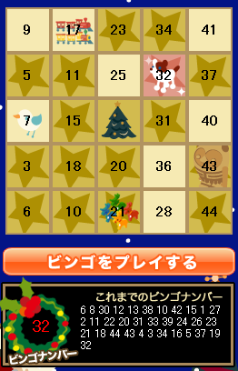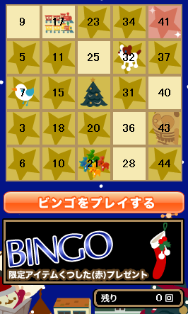 只今クリスマスビンゴ開催中で、課金を一回プレイするか又はカンパイを1日一度するごとにビンゴナンバーをもらえるしくみなのです。